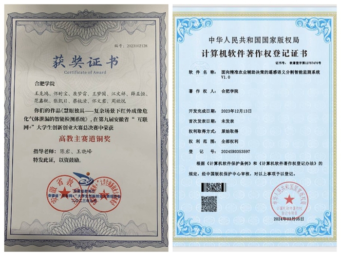 她所在团队凭借作品“复杂场景下红外成像危化气体泄漏智能检测系统”成功获批安徽省2023年度新时代育人质量工程项目(研究生教育)。该系统主要利用高分辨率红外摄像实时监测气体泄漏过程,通过定位、气体类型、判断和自动报警等多种方式,精确地识别和定位危险气体泄漏源,在第一时间发出警报通知相关人员处理,可避免更多的损失和事故,提高工厂的生产效率和安全指数。